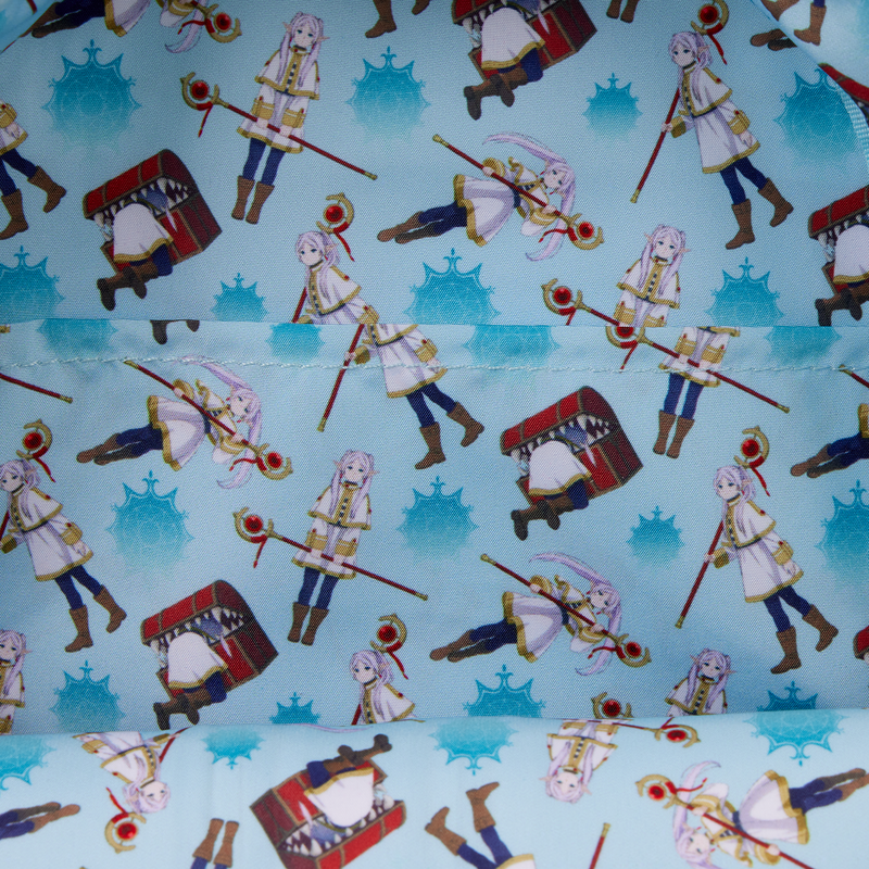 Dieser Mini-Rucksack ehrt Frierens Outfit und ist komplett mit Satinmaterial sowie goldenen und roten Details versehen. Als Reißverschlussanhänger der Vordertasche dient ein Anhänger ihres Stabs. Drehe den Rucksack um, um auf der Rückseite ein Bild von Frieren zu entdecken!