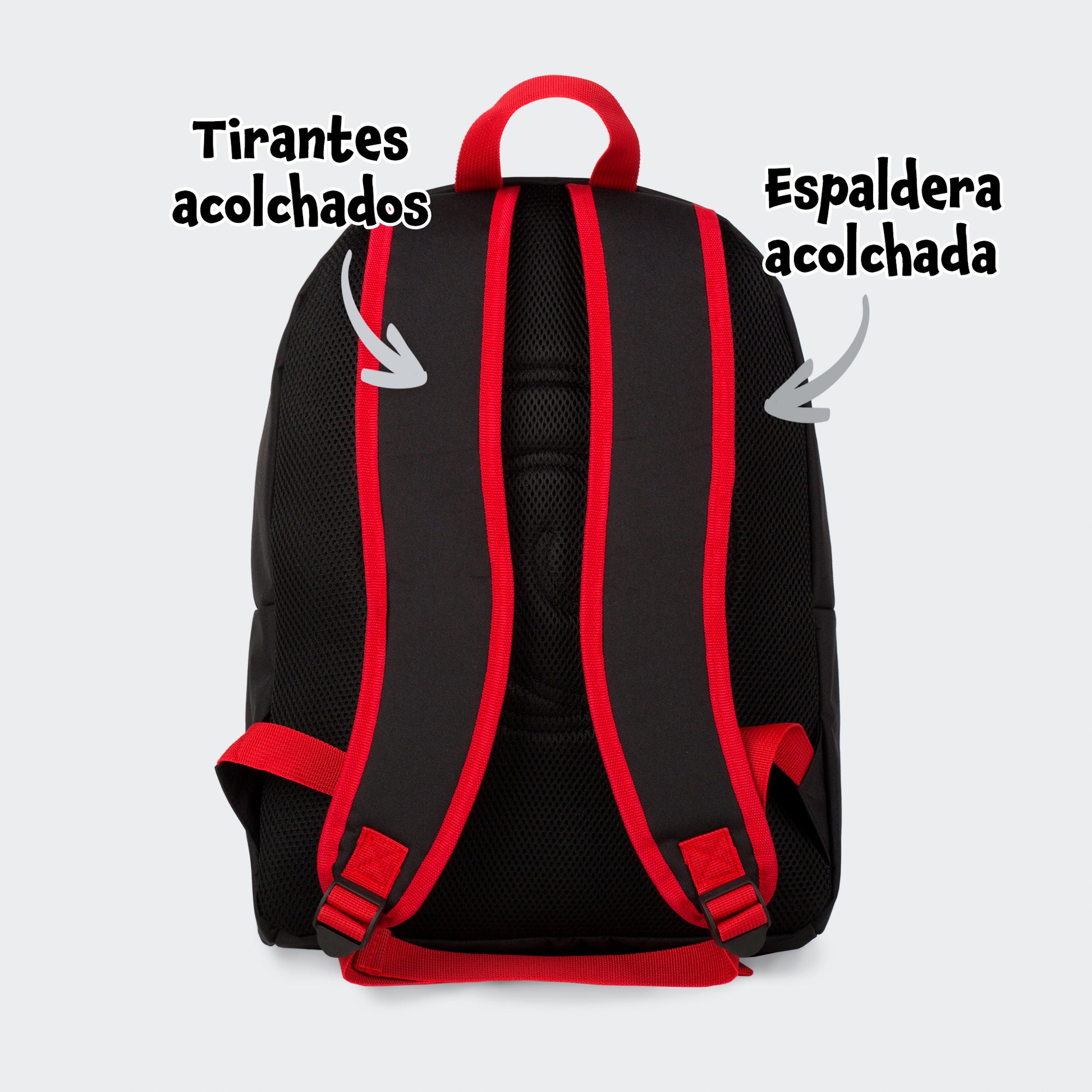 Tiene un compartimento amplio y un bolsillo frontal con el parche de la nube roja de los Akatsuki.
